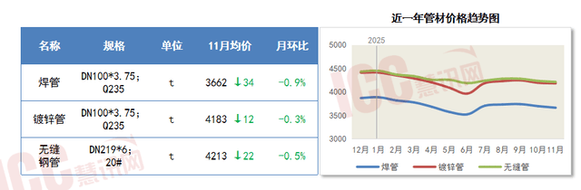 焊管、镀锌管和无缝钢管价钱微幅下跌。跟着天气转冷,建材产物出产比上月加速。