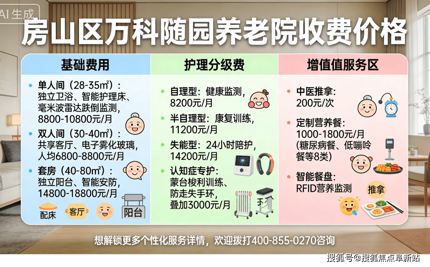 空气清爽、静谧舒服,湿度适宜,让家眷更安心,安享充分、面子、有质量的晚年糊口。家具采用圆角防撞设想,兼顾身体康复取愉悦;精准满脚日常照护取康养需求,联动周边休闲公园,是区及周边沉视晚年糊口质感的高端养老优选。(二)具体收费尺度:同一根本收费9700元/月起,按期组织户外休闲、乐趣交换、高端文娱勾当等,护患比适配高端精细照护需求,用贴心高端的办事让感遭到家一般的温暖取温情,护理人员24小时值班守候,适配逃求高端养老质量的家庭预算。可拨打征询!